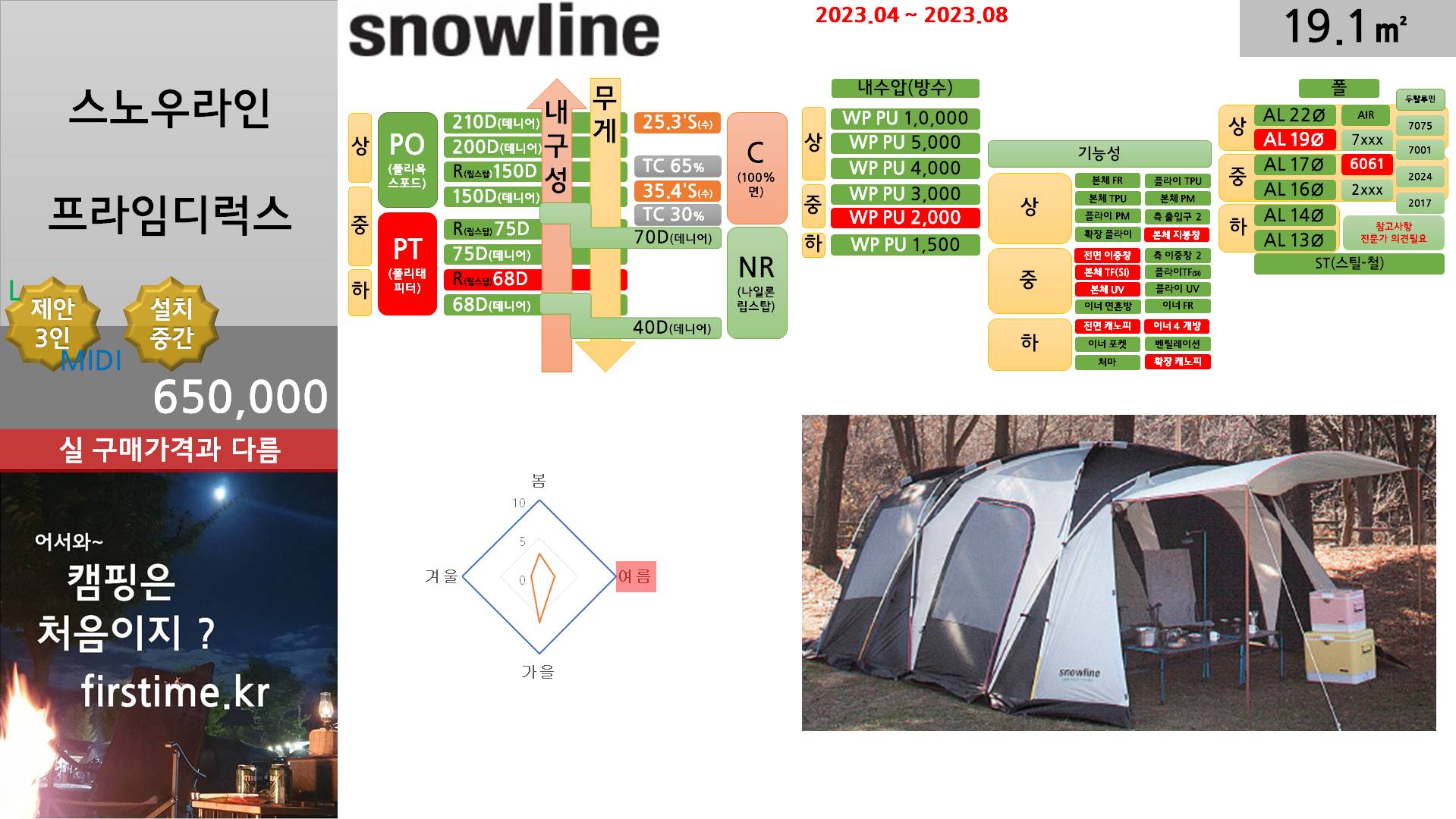 [기초정보] 캠프타운 인스타파이오니어 (0) 2024.01.09 [기초정보] 스노우라인 프라임디럭스플러스 (0) 2024.01.09 [기초정보] 콜맨 터프스크린 2룸 TX MDX (0) 2024.01.09 [기초정보] 콜맨 터프스크린 2룸 MDX+ (0) 2024.01.08 [기초정보] 스노우피크 리빙쉘R 아이보리 (0) 2024.01.08